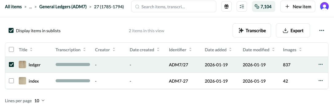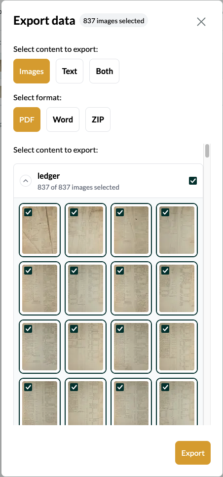 I tried exporting the transcriptions for an entire sublist (containing 837 images). On two different browsers and with many different option permutations (e.g. both images and transcripts or just transcripts; with PDF, Word, or HTML output), I got a 400 error code (see attached screenshot) every time.