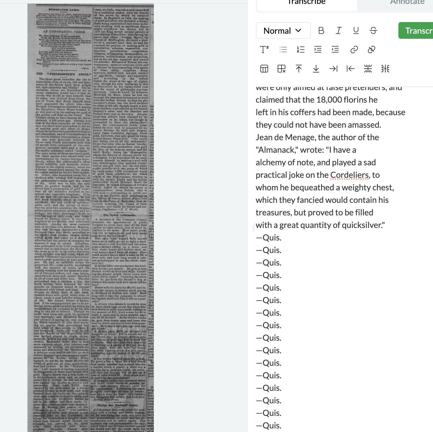 The second pdf was better – no problem transcribing — but had the same issue converting one pdf file into two documents (this seems to be a feature, not a bug). Since I imagine many people will be trying to transcribe directly from downloaded pdf files of this sort (these get produced in the same fasion, with two separate pages, for every newspaper database I’ve ever used), it might be worth trying to train Leo to ignore the “header” page. For now I’ll just go back to taking screen shots from my pdf files…