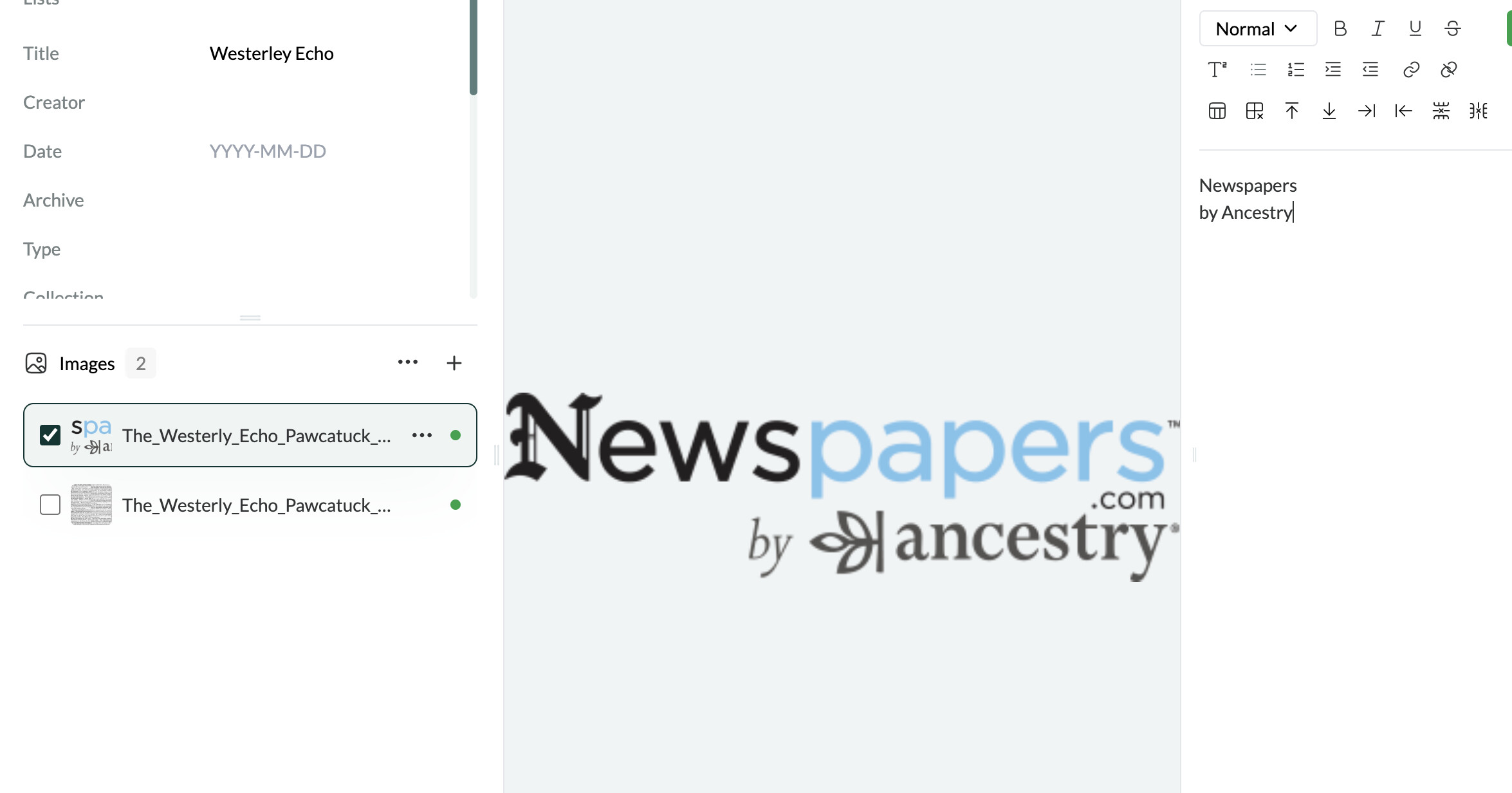 With print sources, up to now I was only transcribing screenshots I took from newspaper databases. I thought I’d see what Leo did with pdf files that I downloaded directly from the database: mixed results. When I upload the file, it creates two documents automatically: one with the company that operates the database, and the other with the actual document.