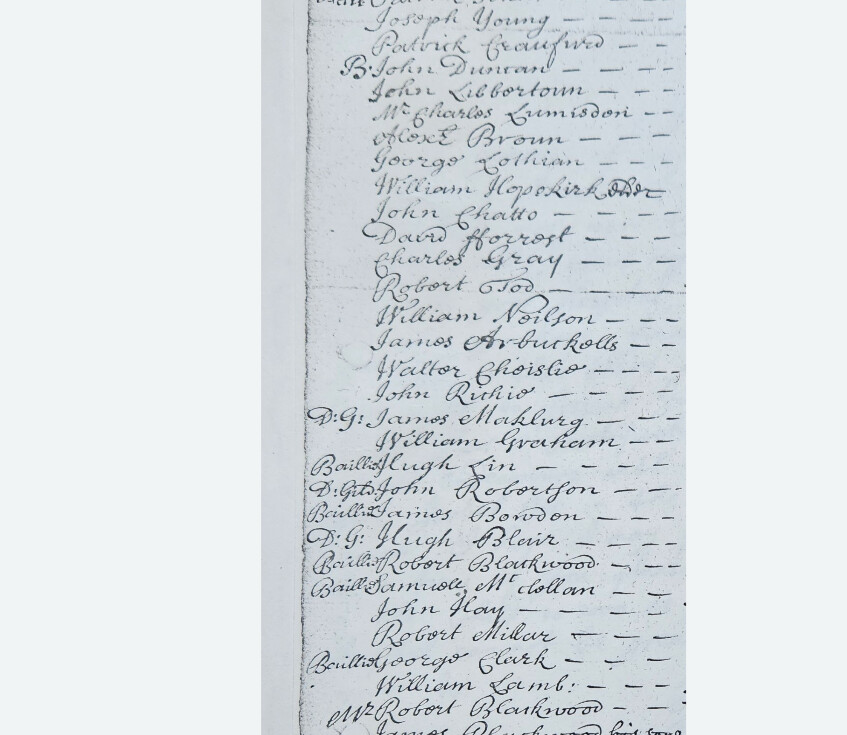 My Hair 10 Baillie Hugh Cunningham 10 Baillie George Warrander 10 Bail Patrick Johnstown 10 Joseph Young 10 Patrick Crawford 10 B: John Duncan 10 John Libbertown 10 Mr Charles Lumisdon 10 Alexr Broun 10 George Lothian 10 William Hopekirk elder 10 John Chatto 10 David Forrest 10 Charles Gray 10 Robert Tod 10 William Neilson 10 James Arbuckells 10 Walter Choislie 10 John Richie 10 D:G: James Maklurg 10 William Graham 10 Baillie Hugh Lin 10 D:Geld. John Robertson 10 Baillie James Bowdon 10 D:G: Hugh Blair 10 Baillie Robert Blackwood 10 Baillie Samuell McCollan 10 John Hay 10 Robert Millar 10 Baillie George Clark 10 William Lamb 10 Mr Robert Blackwood 10 James Blackwood his son 10 Robert Watson 10 William Patonyel 10 Baillie Adam Broun 10 George Lind 10 John Kennedy 10 Thessr. Edward Marjoribanks 10 Thessr. Thomson 10 S[i]r John Hall of Dunghless 10 Jasper Johnston of Aberristoun 10 Jonservantson factor 10 Mr Ackman 10 S[i]r Ned Muir of Thorntown 10 James Balfour 10 Wm Glenwood 10 Bail. Prince 10 Tha: Spencer 10 Mr Tho: Rig 10