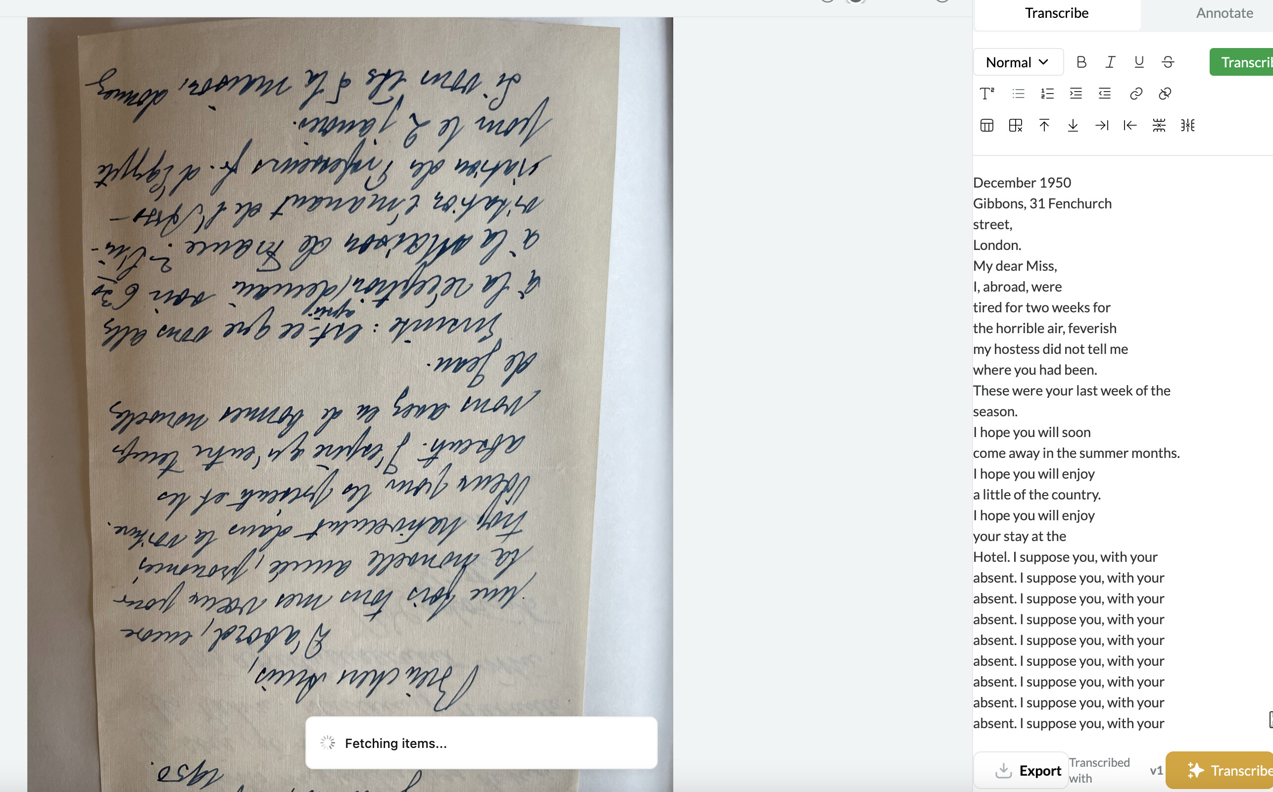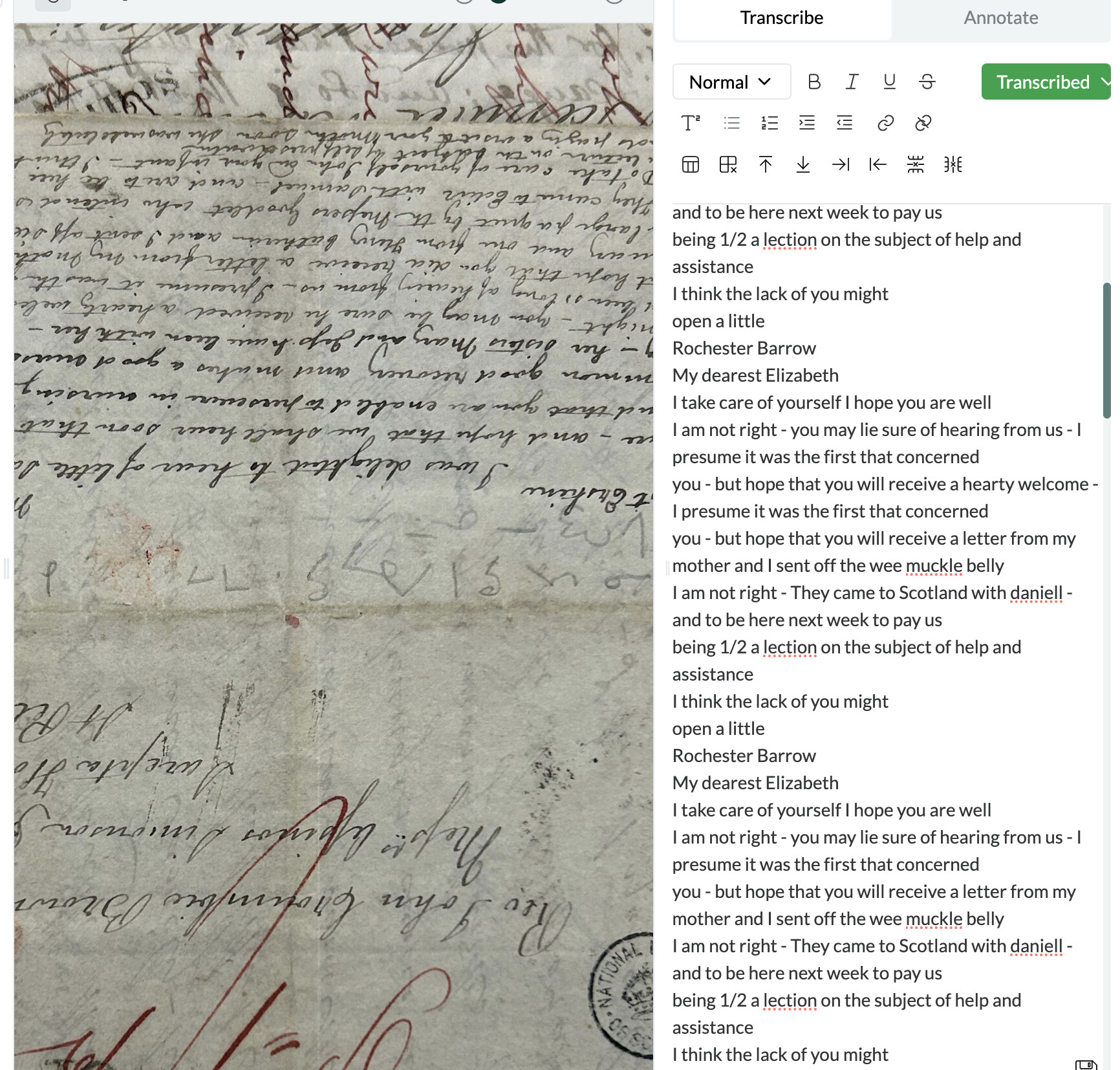 With mixed results! I didn’t notice that this page was upside down until after I had uploaded it. The transcription was pretty good (especially sinc the letter was also lopped off on one edge), but Leo got very cinfused at one point and started repeating himself – not the whole letter, just the last half.
