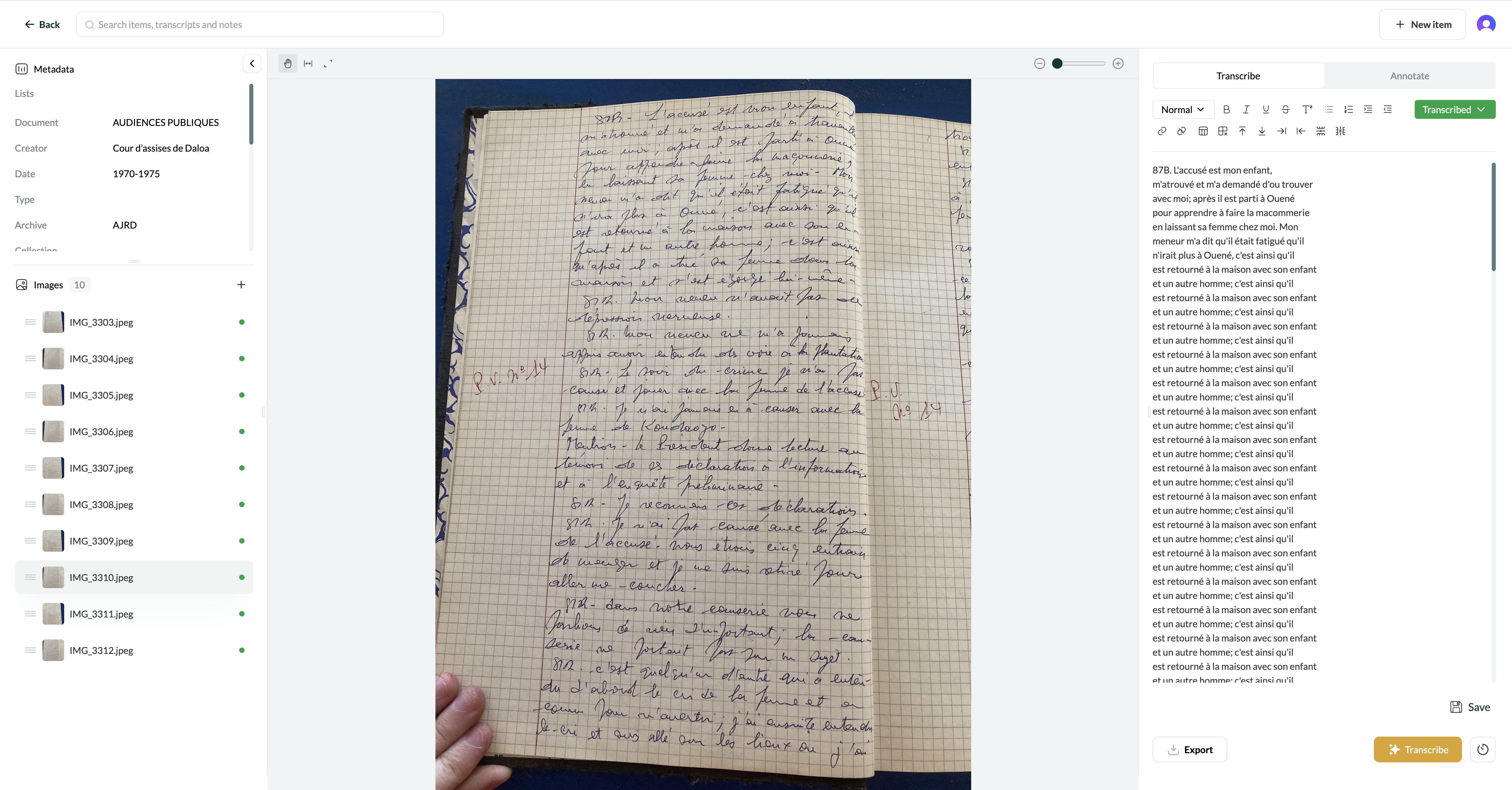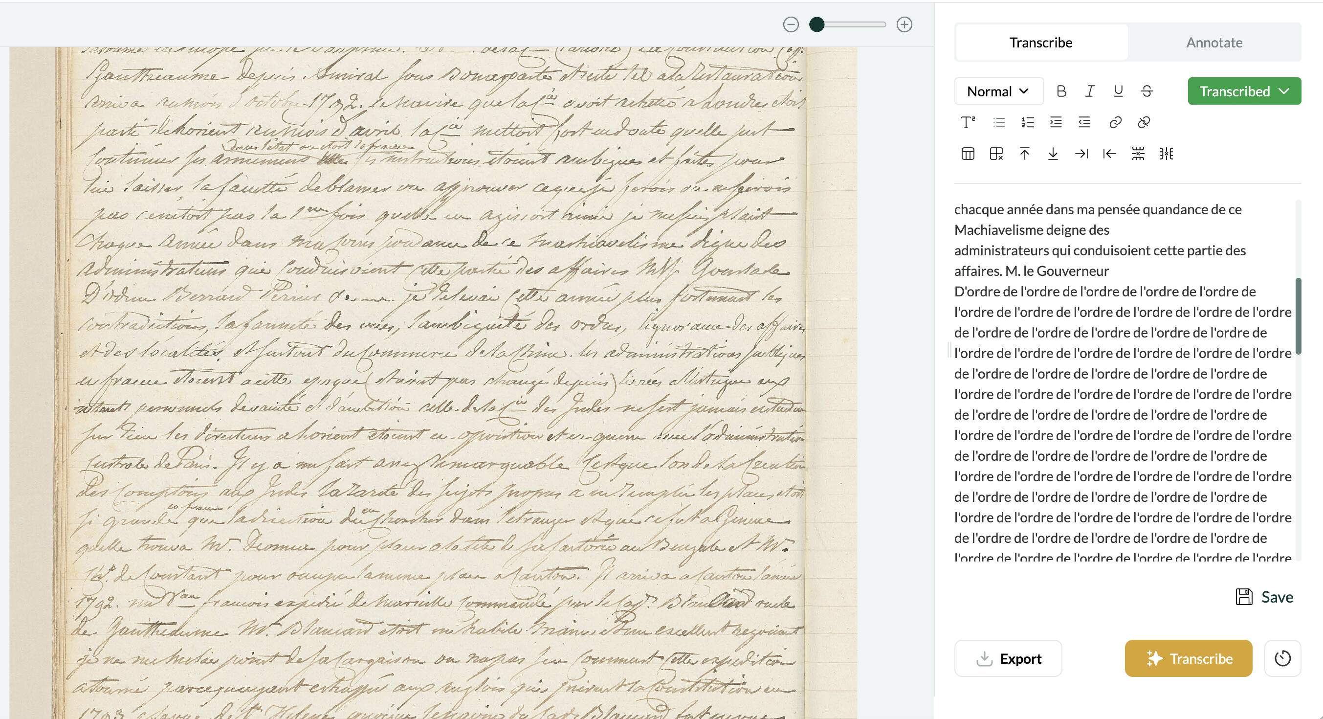 I have had the same problem w/ transcriptions from French. In some cases, the uploaded image included some text from the following page which I could crop to fix. The attached screenshot seems like it would be fine, but Leo still struggles with it.