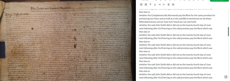 This is a legal bill from the court of Exchequer. These bills generally have stains, holes, and ink blots etc on them, and a few other transcripts with these same features have also thrown Leo in the same way. I don’t know if there is a way to train it to get round these kind of issues? Or for it to come up with a special character to insert in these cases that signifies a hole/discoloured section/?