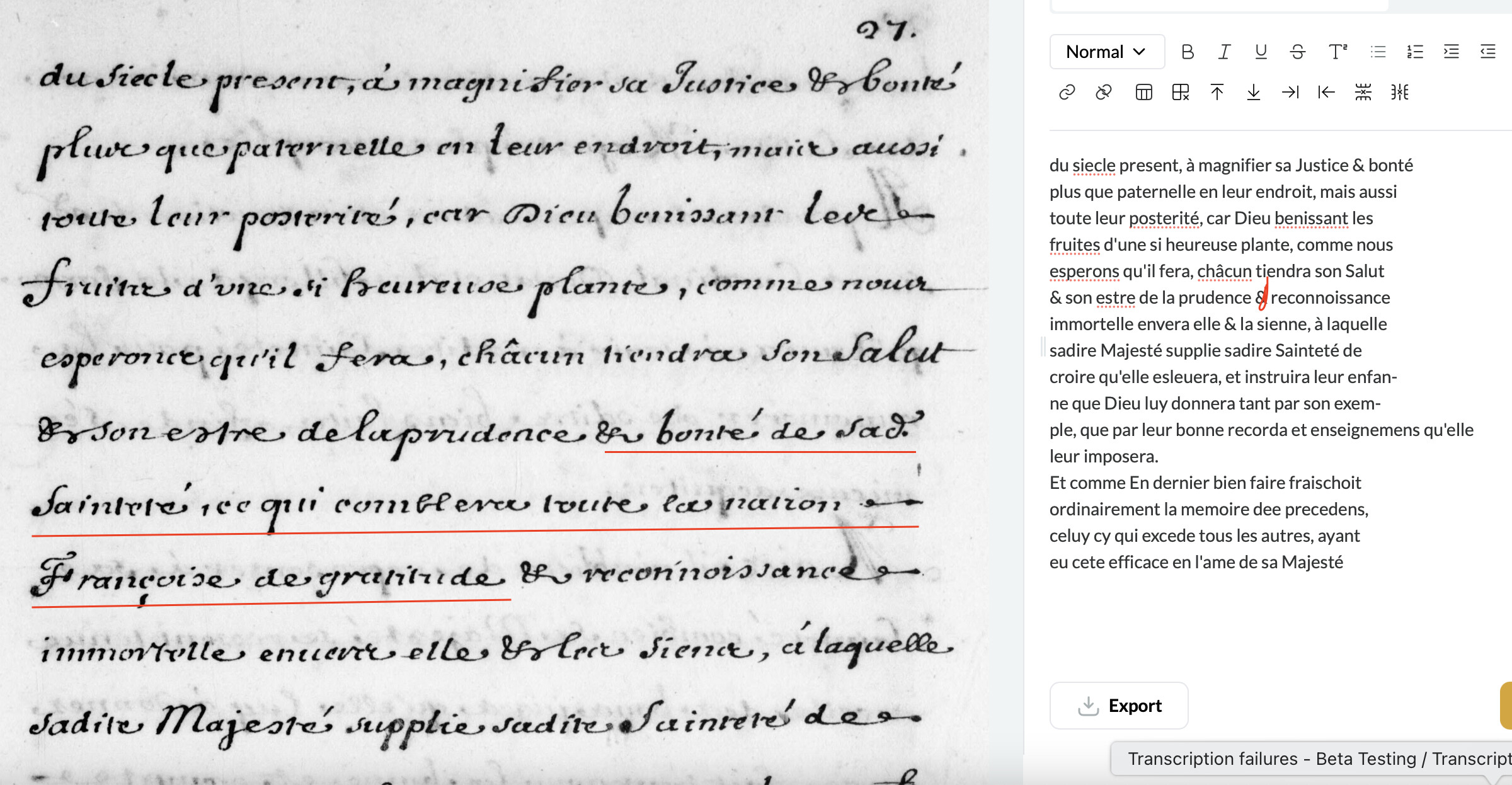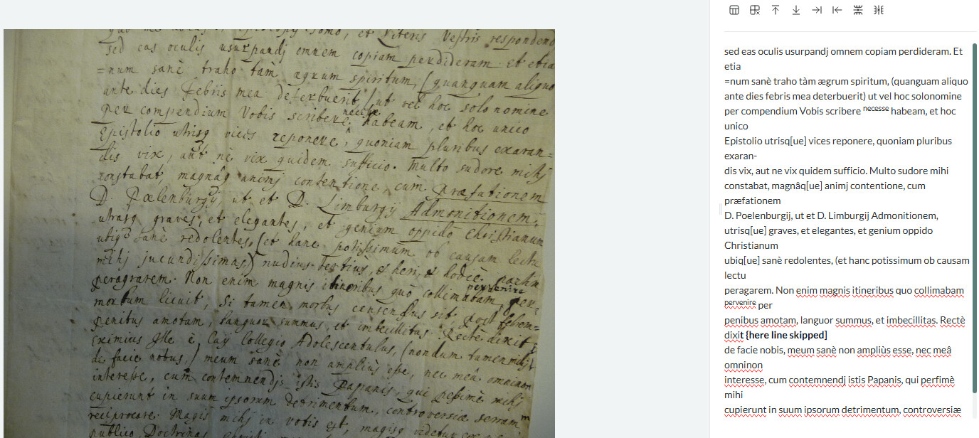In French, I have noticed a couple of times when lines in the document have been skipped in the transcription. See screenshot, where I have highlighted what I have added so far, as well as the next line which is also missing.