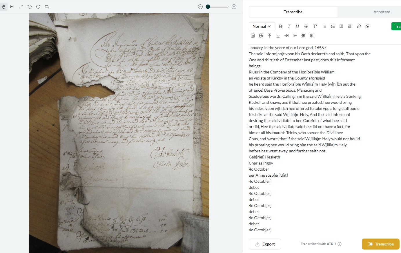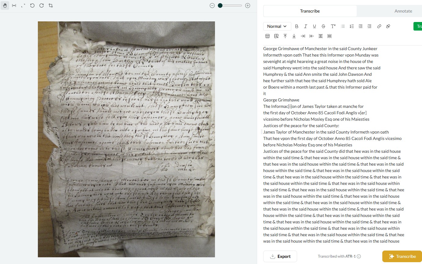 Leo often works better with the bills and answers, but less well with depositional material. I think this is because depositions feature indented names and marginalia numbers, which Leo struggles to place on a page - in the transcript of the example photo Leo transcribed the main text, but often missed out the deponent’s information (name, age etc) which was inset on the page.