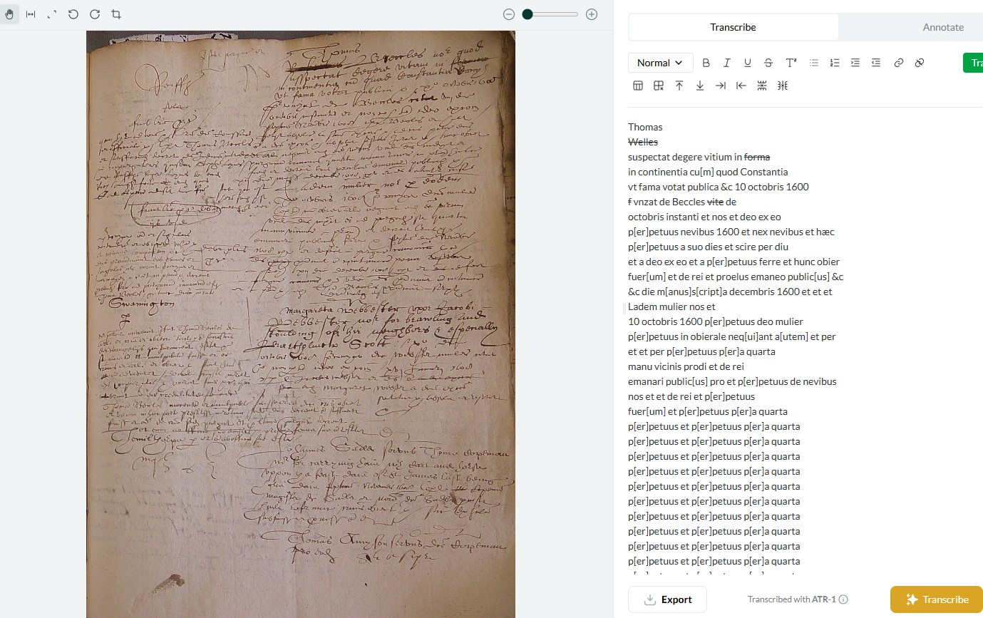 Chiming in on transcription issues. In addition to struggling with images that aren’t oriented correctly, I’ve noticed occasional trouble with layered documents of the kind that appear often in bound volumes (handwriting next to printed text; pages of different sizes, so that a single image captures part of an additional document, etc). Here’s an example where transcription fell into the doom loop.